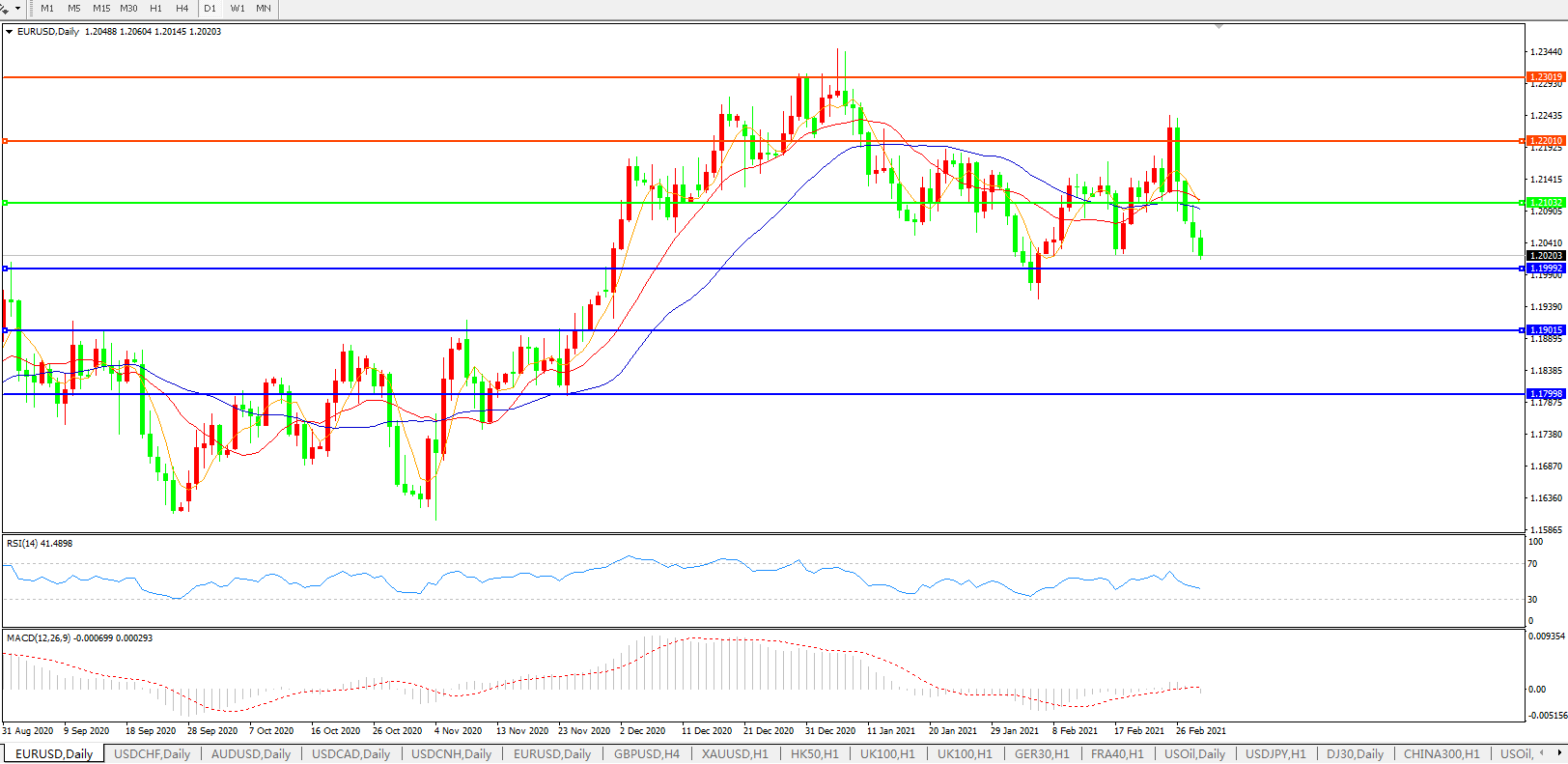 交易策略:1.2100下方看跌,目标1.2000、1.1900