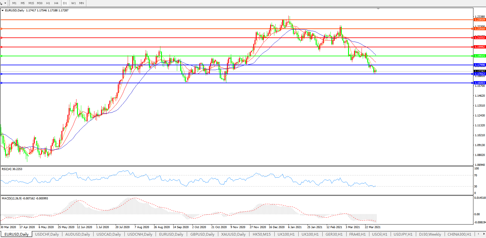 技术面简析:日图短均线呈发散下行态势,汇价持续弱势下行,MACD运行于0轴下方但量能0轴下微放量,RSI震荡走弱,预计短期汇价大概率将进一步走低。