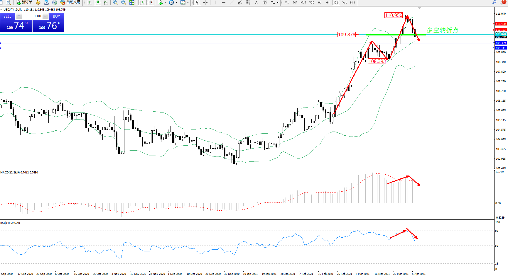 技术点评:多头动力延续布林带指标上轨附近持续震荡上扬,高位抵达110.956位置后遇阻回撤,空头动力短期反转下行走势持续,即将触及布林带指标中轨附近节点,布林带指标呈张口走势后开始有收口迹象,MACD指标处于多头区域高位维持整理持续平移,RSI指标高位触及超买区80均衡线附近节点后遇阻急速反转下行中;