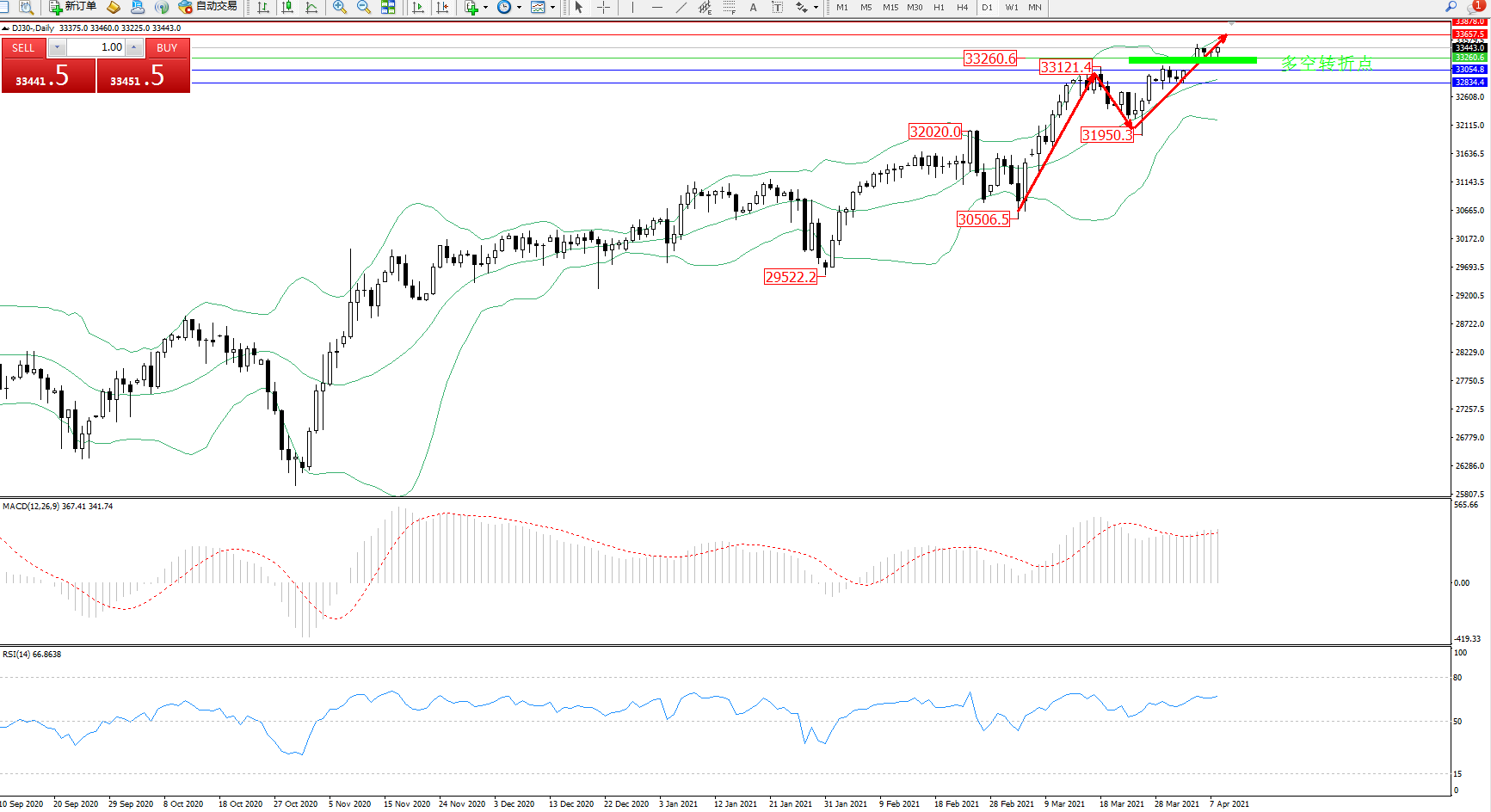 道琼斯指数4月8日(周四)收盘上涨57.31点,涨幅0.17%,报33503.57点;美股收盘,道指初步收涨,市场交投清淡,苹果、特斯拉等巨头上涨,能源生产商和银行股下跌。此前美联储主席鲍威尔表示央行具有遏制通胀压力的工具,随着经济解封,预期通胀会暂时上升。鲍威尔表示,如果通胀预期持续变化,并显著超过我们希望的水平,我们会作出回应。他还指出,全球各国疫苗接种进度的参差不齐可能对经济复苏构成风险。经济复苏既不完全也不均衡。鸽派基调依然可控,鲍威尔的谨慎言论再次传达出美联储维持超宽松立场的信号。距离美联储减少对美国经济的支持还很遥远,今年预期中的物价上涨可能是暂时的,并警告称,新冠新确诊病例数增加可能会减缓复苏。
