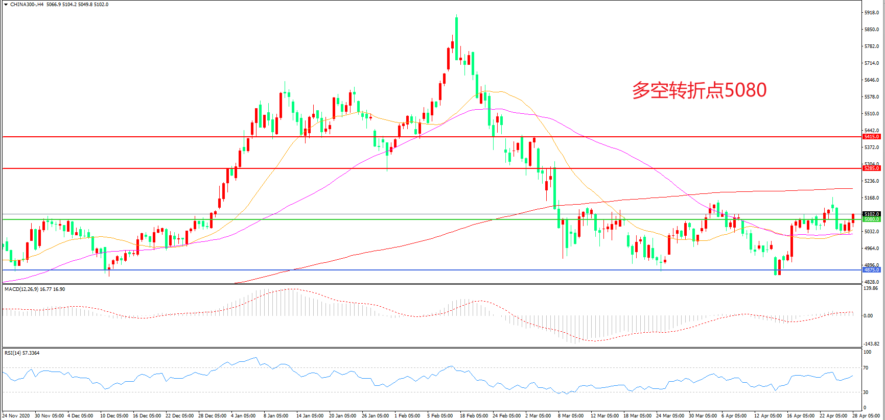 4小时图看,沪深300以55均线为依托震荡反弹,短期走势有所回暖,均线系统粘合形成下方支撑,200周期均线成为上方阻力,MACD红柱增加,RSI指标走平,日内震荡上行概率较大。