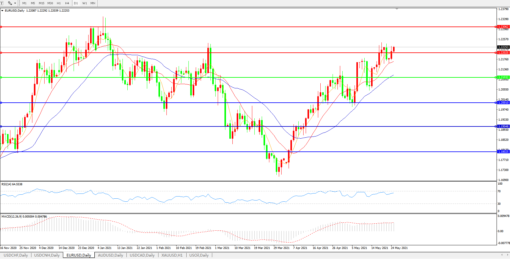 欧元兑美元在周一欧市盘初小幅走高,重新逼近1.22关口;此前美元指数受研报显示美国通胀预期可控的消息而继续走软,推动非美货币集体走强。不过日内欧洲多国处于假日休市之中,也并未重磅经济数据发布,这一消息面真空状况仍限制了汇价的波动幅度;当前欧元兑美元阻力位仍在前期双重高点水平1.2245附近,市场也正观望此后美联储官员关于通胀与政策前景预期的的进一步表态;若美国官员措辞意外鸽派,欧元汇价仍将首先回踩1.2160处的上周双重低点兼10日均线切入位水平
