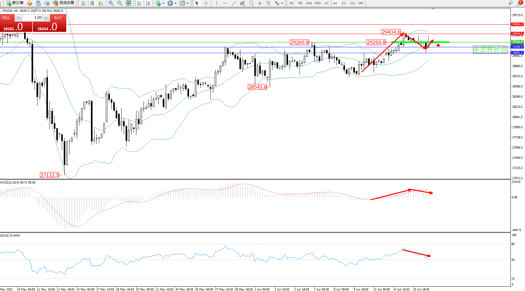 技术点评:多头动力延续布林带指标通道上轨附近节点不断向上拉升中,高位抵达29434附近整理后遇阻回撤,短期开始弱势徘徊,布林带指标呈缓慢张口走势持续中,MACD指标处于0轴线上方多头区域持续整理平移,RSI指标处于多头区域高位持续震荡后有平缓下移迹象;