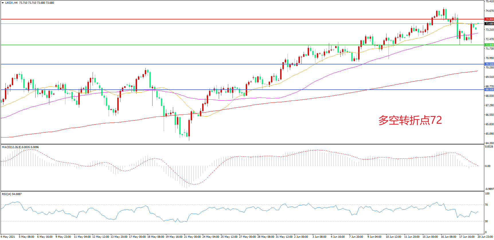 4小时图看,油价先跌后涨,回踩72美元后震荡上行,短期表现相对强势,均线系统走平,MACD红柱缩短,RSI指标走平,日内延续震荡概率较大。