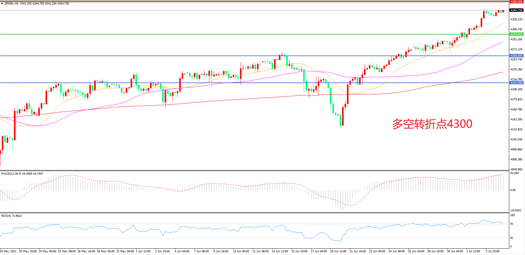 4小时图看,标普500阳线连续拉升,上行趋势较为明显,均线系统呈多头排列,MACD红柱增加,RSI指标走平,日内震荡上行概率较大。