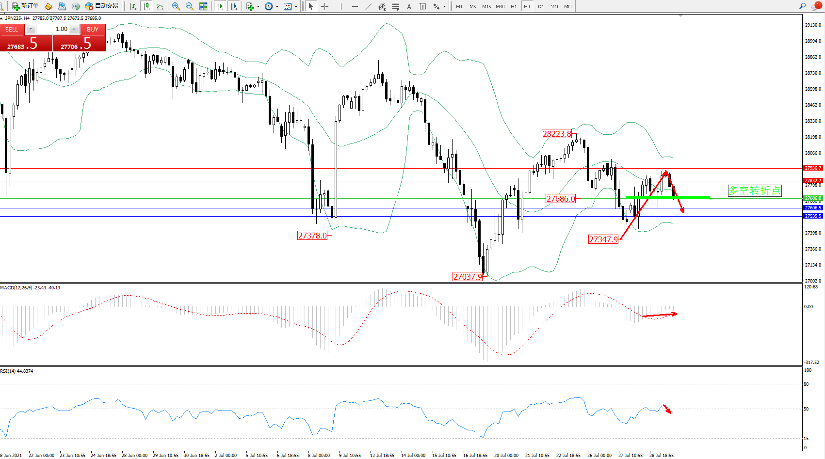 技术点评:空头动力维持布林带指标中下轨区间持续震荡下行,触及27347位置后反转上移,纠结于布林指标中轨附近持续震荡中,空头动力有继续下行态势,布林带指标呈收口走势持续平移中,MACD指标处于0轴线下方空头区域维持整理平移,RSI指标处于50均衡线附近持续整理中;