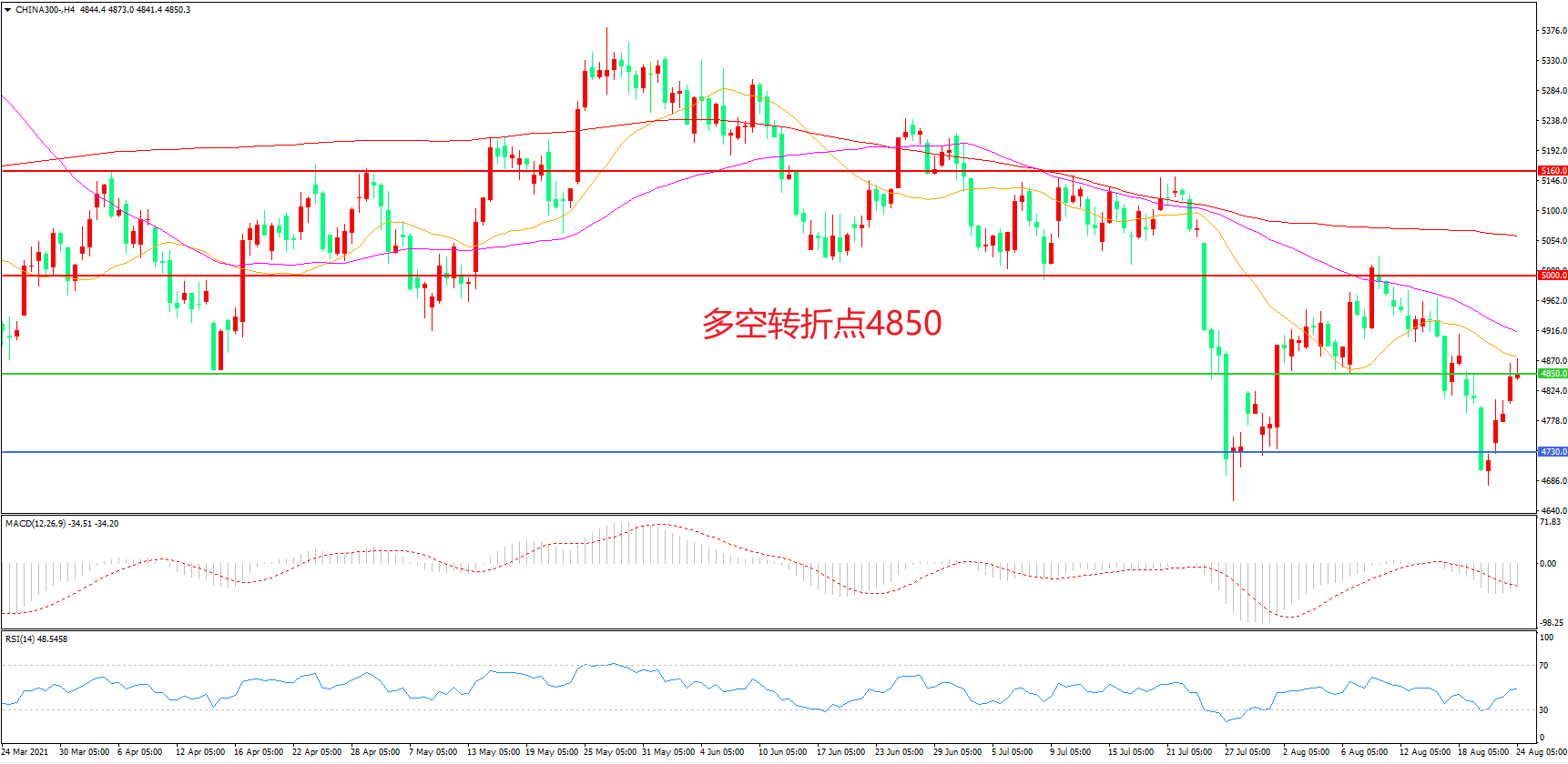 4小时图看,沪深300震荡拉升,短期走势有所回暖,均线系统成为上方阻力,4850成为短期多空分水岭,MACD绿柱缩短,RSI指标走平,日内延续震荡概率较大。