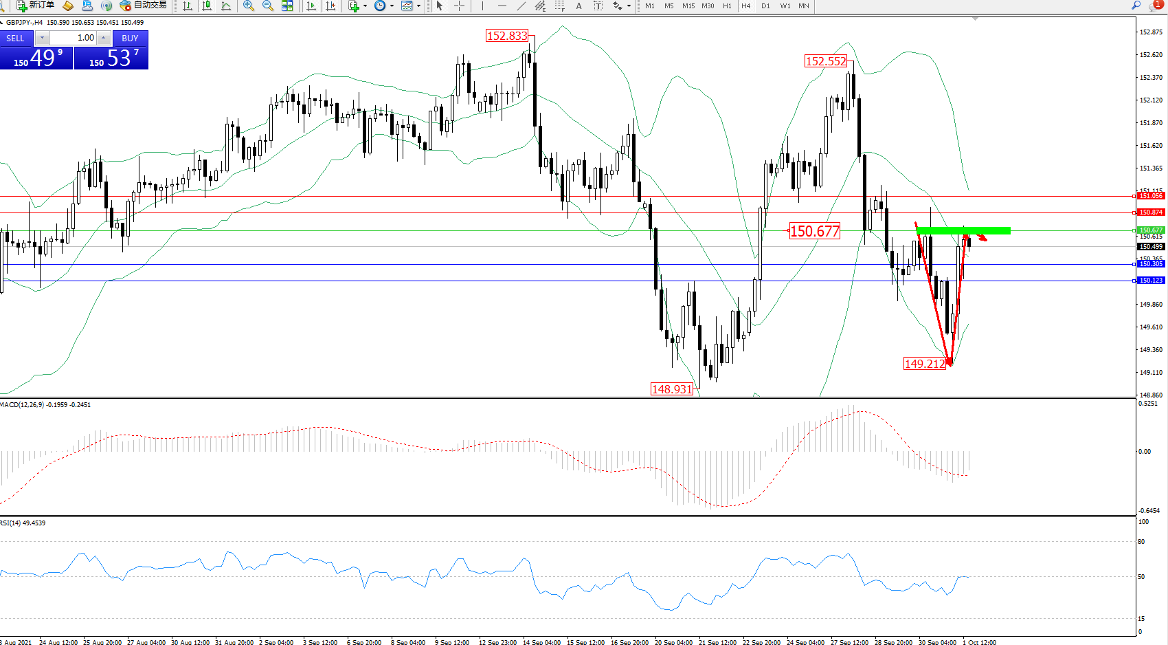 技术点评:空头动力延续布林带指标中下轨区间持续震荡下挫后,低位抵达149.212位置急速回升,呈V型反转走势强势拉升至布林带指标中轨附近节点,开始短暂遇阻整理,布林带指标呈收口走势中,MACD指标处于空头区域持续整理中,RSI指标处于50均衡线附近弱势徘徊中;