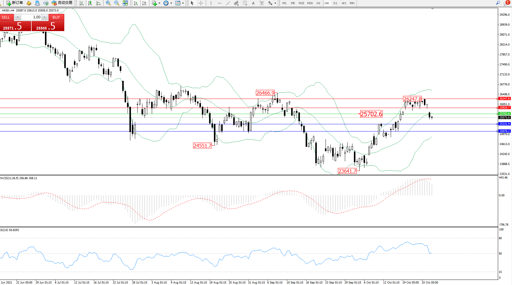 技术点评:低位多头动力延续布林带指标中上轨区间持续震荡上扬,高位短期处于26247位置下方窄幅整理平移,多头动力短期乏力,空头动力伺机入场,跌破布林带指标中轨位置节点后有继续回撤下移迹象,布林带指标呈上行趋势后开始缓慢走平,MACD指标处于多头区域高位整理缓慢下移,RSI指标处于多头区域持续震荡下行至50均衡线附近整理;