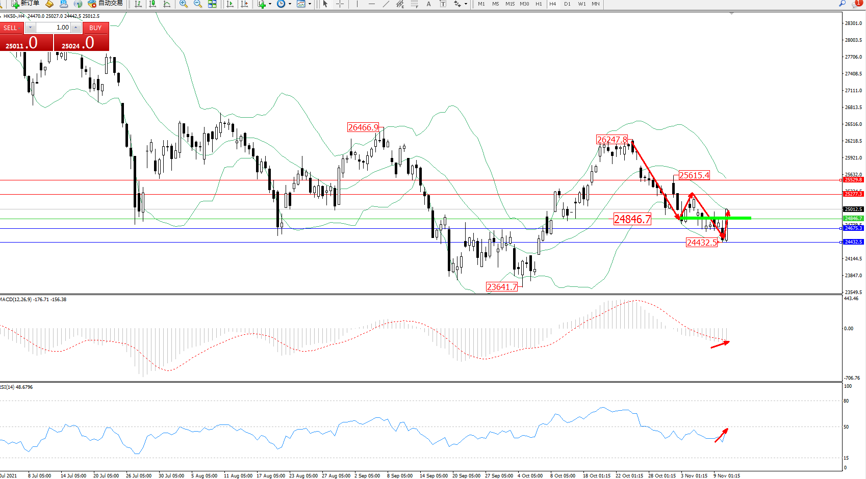 香港恒生指数11月10日(周三)收盘上涨183.01点,涨幅0.74%,报24996.14点;港股三大指数探底回升,且尾盘涨幅进一步扩大。恒生科技指数涨2.06%报3759点。大型科技股集体上扬,腾讯、网易涨超4%,美团、阿里巴巴、小米、百度皆涨超2%;消息称房企发债融资有望回暖,内房股与物管股携手大涨,昨日大涨的电力股全线回调,乳制品股、汽车股、教育股走低明显。今日大市成交额为1362亿港元,南下资金逆势净流入27.73亿港元。