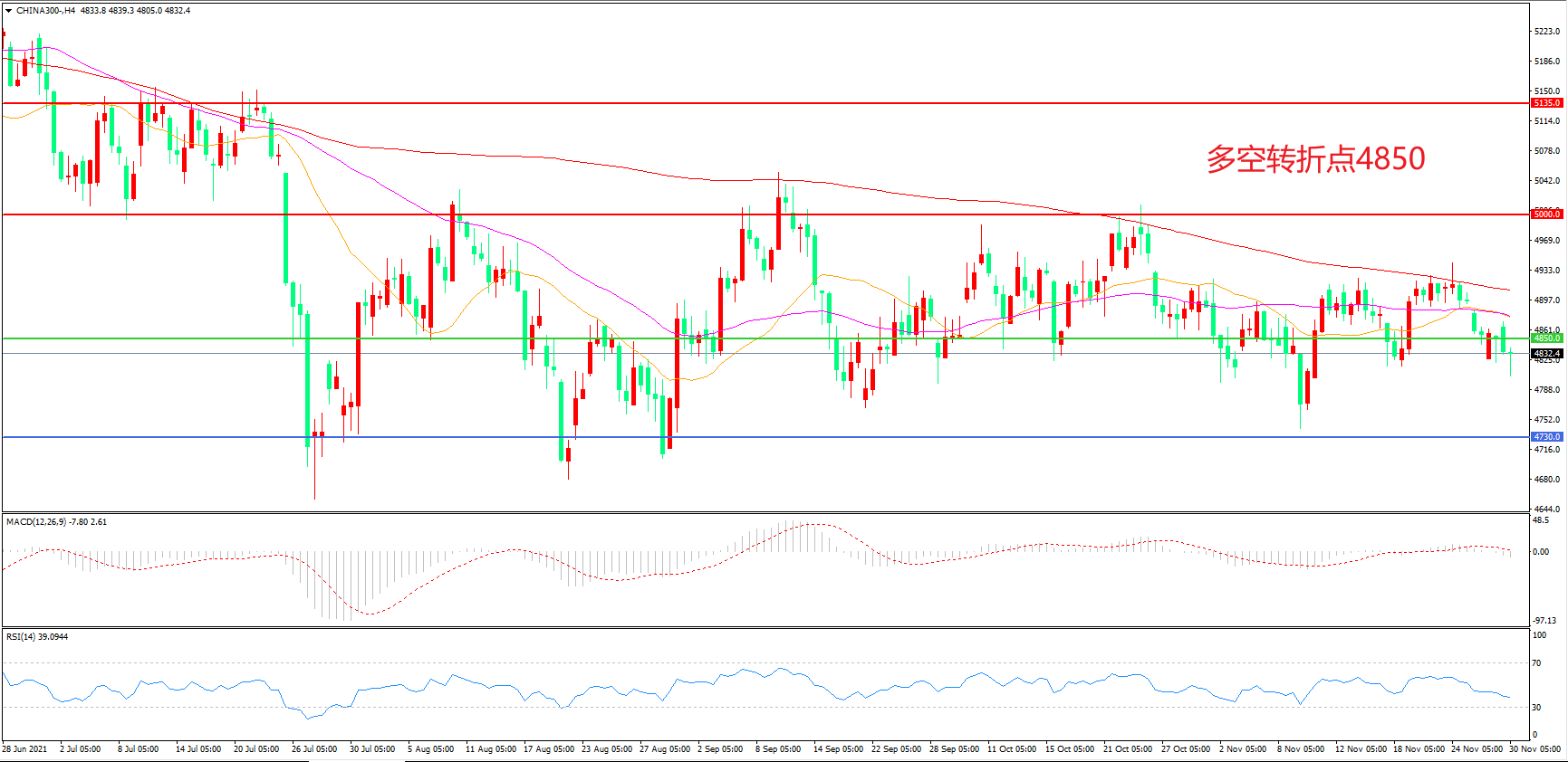 周二(11月30日),受隔夜外围市场上涨带动,三大指数全线高开,但随后震荡走低,弱势格局明显,沪深300震荡下行,收报4832.4点。两市合计成交12219亿元,北向资金净流出34.11亿元。鉴于全球再度处于新冠变异毒株干扰的背景下,或将打乱美联储加息节奏,在成交量没有出现明显变化的情况下,A股短期难改震荡走势。