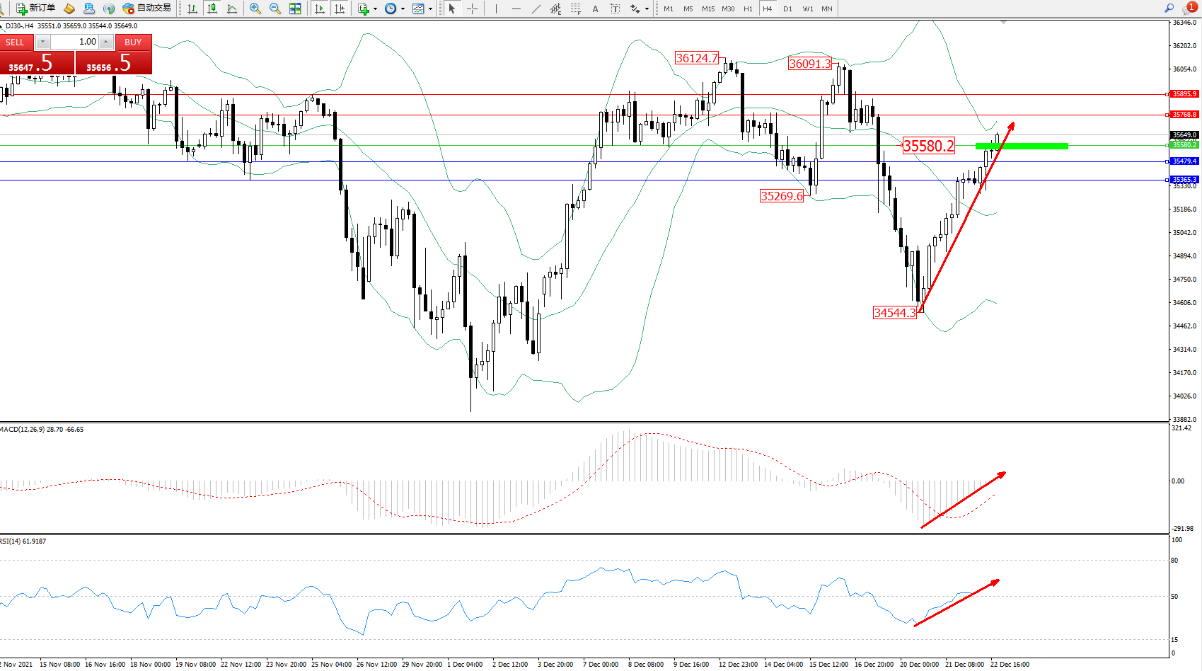 道琼斯指数12月22日(周三)收盘上涨261.26点,涨幅0.74%,报35753.96点;美股收盘,三大股指全天维持涨势,拜登支出计划受阻以及奥密克戎的不确定性限制了美元上行空间。预期阻止了美元在上周美联储鹰派政策更新的背景下进一步走强,市场参与者尚不相信美联储将能够贯彻执行明年三次加息的计划,并在接下来的几年将政策利率提高到2%以上。