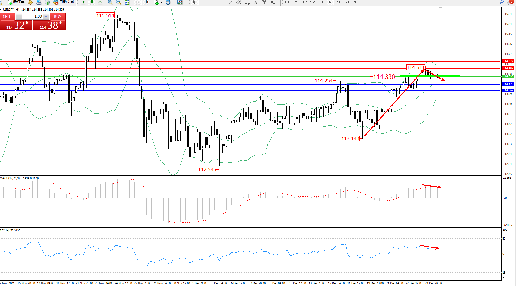 技术点评:多头动力延续布林带指标通道中上轨区间持续震荡上扬,高位抵达114.511位置后遇阻回撤,短期高位开始调整,布林带指标呈收口走势持续中,MACD指标高位维持整理平移,RSI指标处于多头区域维持整理弱势徘徊中;