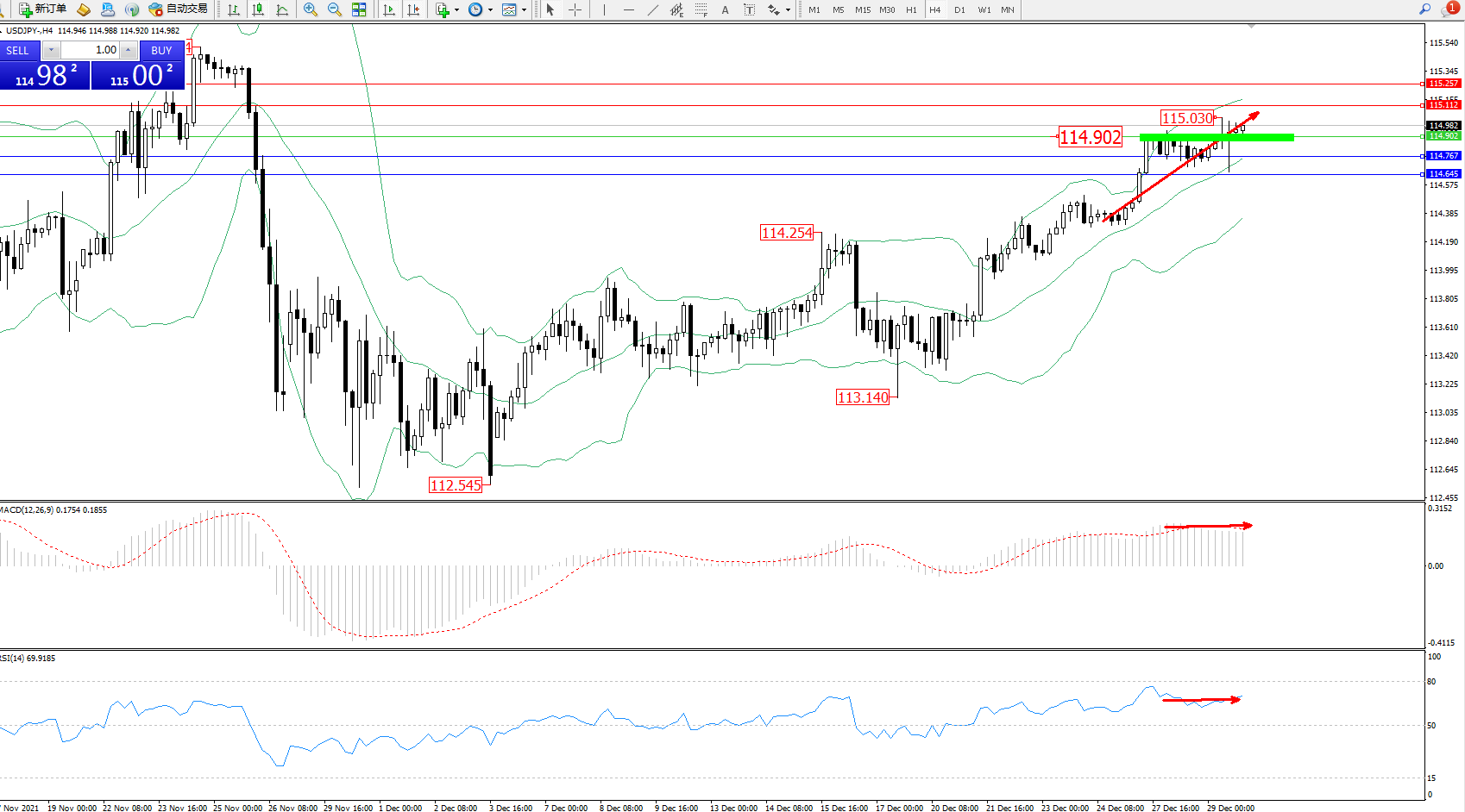 交易策略:114.902上方看涨,目标115.112、115.257