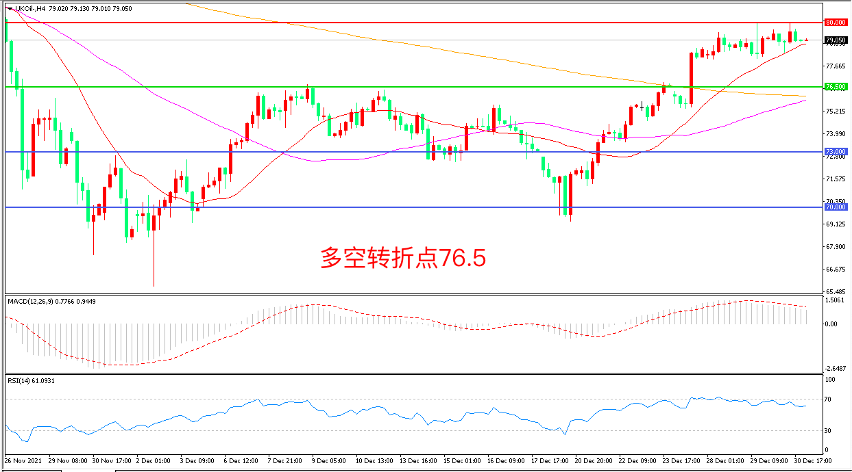 周三(12月30日),2021年还剩最后一个交易日,多空似乎都表现得比较谨慎,布伦特原油延续窄幅震荡,收报79.05美元/桶。虽然奥密克戎传播的速度比较快,但目前仍然没有对油价产生致命的影响,目前OPEC+将于下周再次举行会议,如果最终增产结果与预期出现较大出入将引发油价巨幅波动。