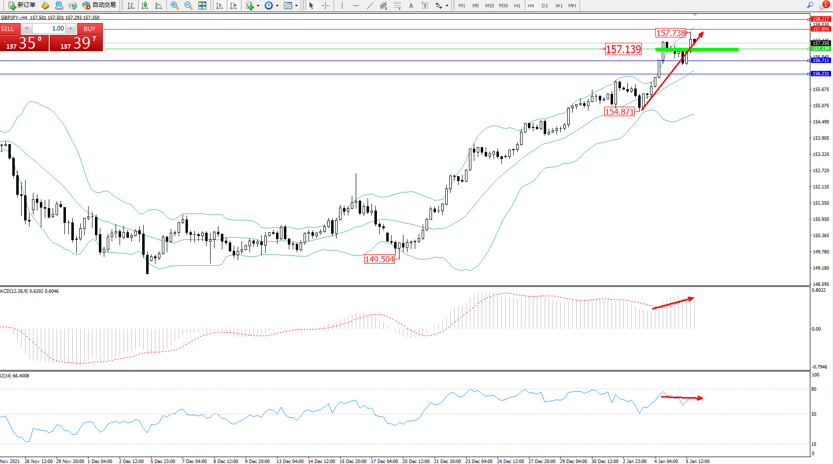 交易策略:157.139上方看涨,目标157.856、158.217