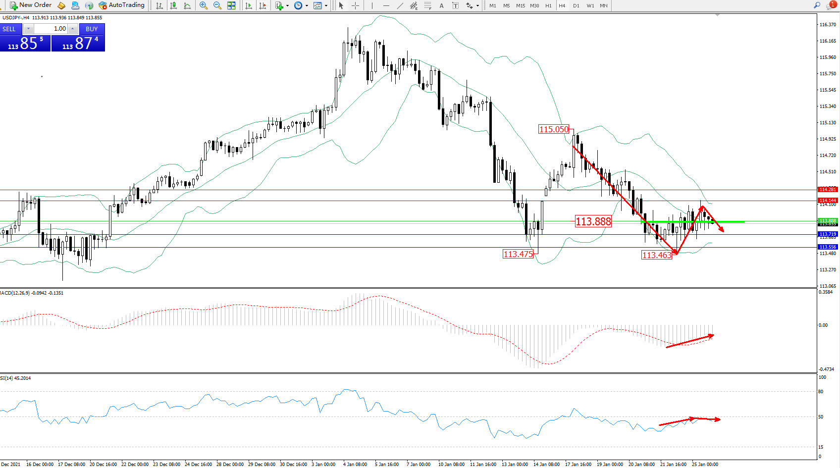 技术点评:空头动力延续布林带指标中下轨区间持续震荡下行,低位抵达113.463位置节点后反转震荡上移,纠结于布林带指标中轨附近持续震荡中,布林带指标呈收口走势持续,波幅空间逐渐收窄,MACD指标处于空头区域维持震荡缓慢上移,RSI指标处于50均衡线下侧弱势徘徊中;