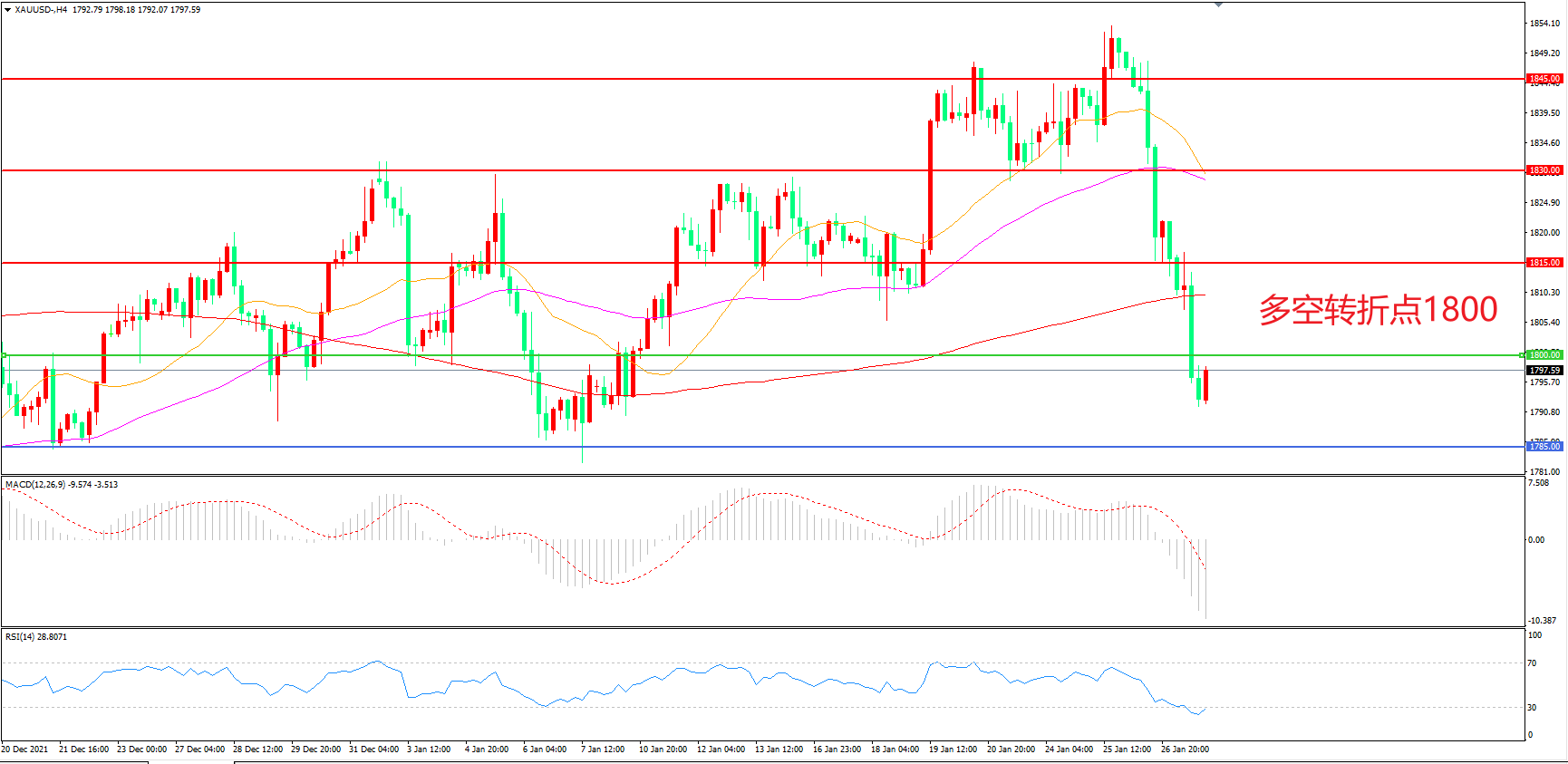 交易策略:在1800.00之下看跌,目标1785.00 1760.00