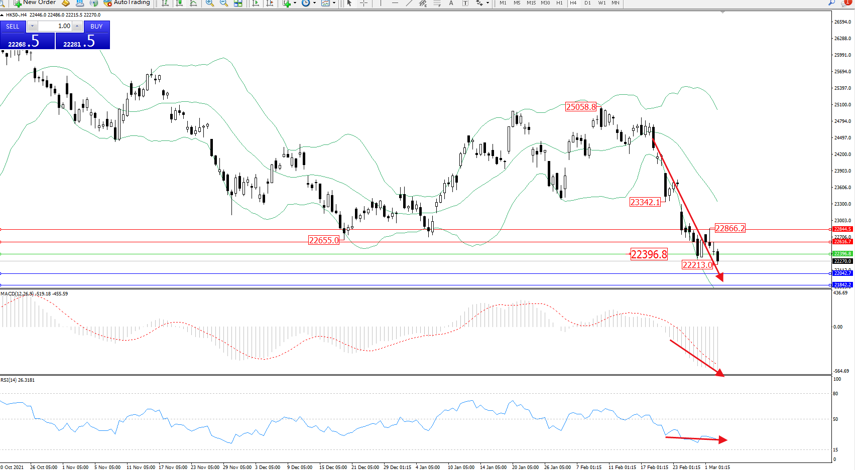 香港恒生指数3月2日(周三)收盘下跌417.79点,跌幅1.84%,报22343.92点;俄乌局势继续影响市场走势,港股再度大跌,再度刷新阶段低价,恒生科技指数更是大跌2.71%,续创历史新低。俄乌战事影响商品供应,石油、煤炭、黄金等有色金属股逆势扬升,在弱势行情中表现突出。据香港经济日报,香港政府正研究以3月26日推行首轮全民强制检测。全民检测共分3轮强制检测,据悉香港政府正探讨7天一检或3天一检方案,并倾向安排3日一检,但仍视检测能力而定,而且检测期间会有一定程度的禁足。消息指,禁足令会在第一轮至第二轮检测期间实施,市民可能要禁足8天或4天。证监会昨日已表明,有信心即使香港政府在全民检测期间限制人员流动,持牌机构及市场仍有合适安排,可正常运作。港交所亦指,无论当前环境如何,目标是保持市场正常运作。
