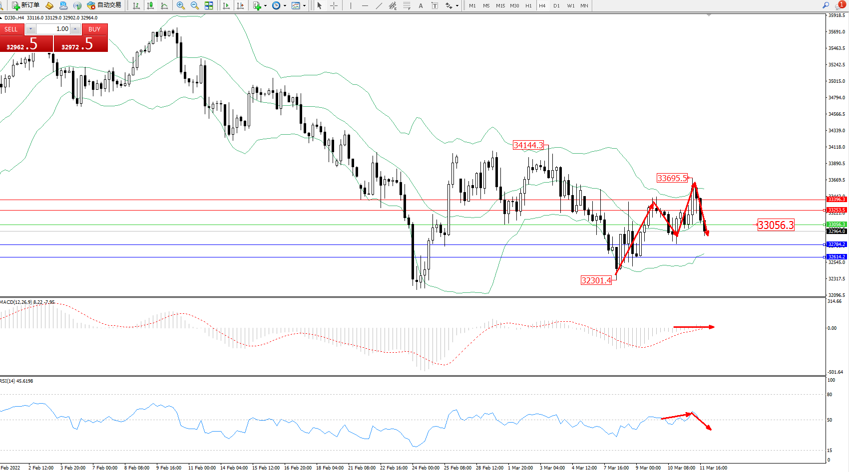 交易策略:33056下方看跌,目标32784、32614