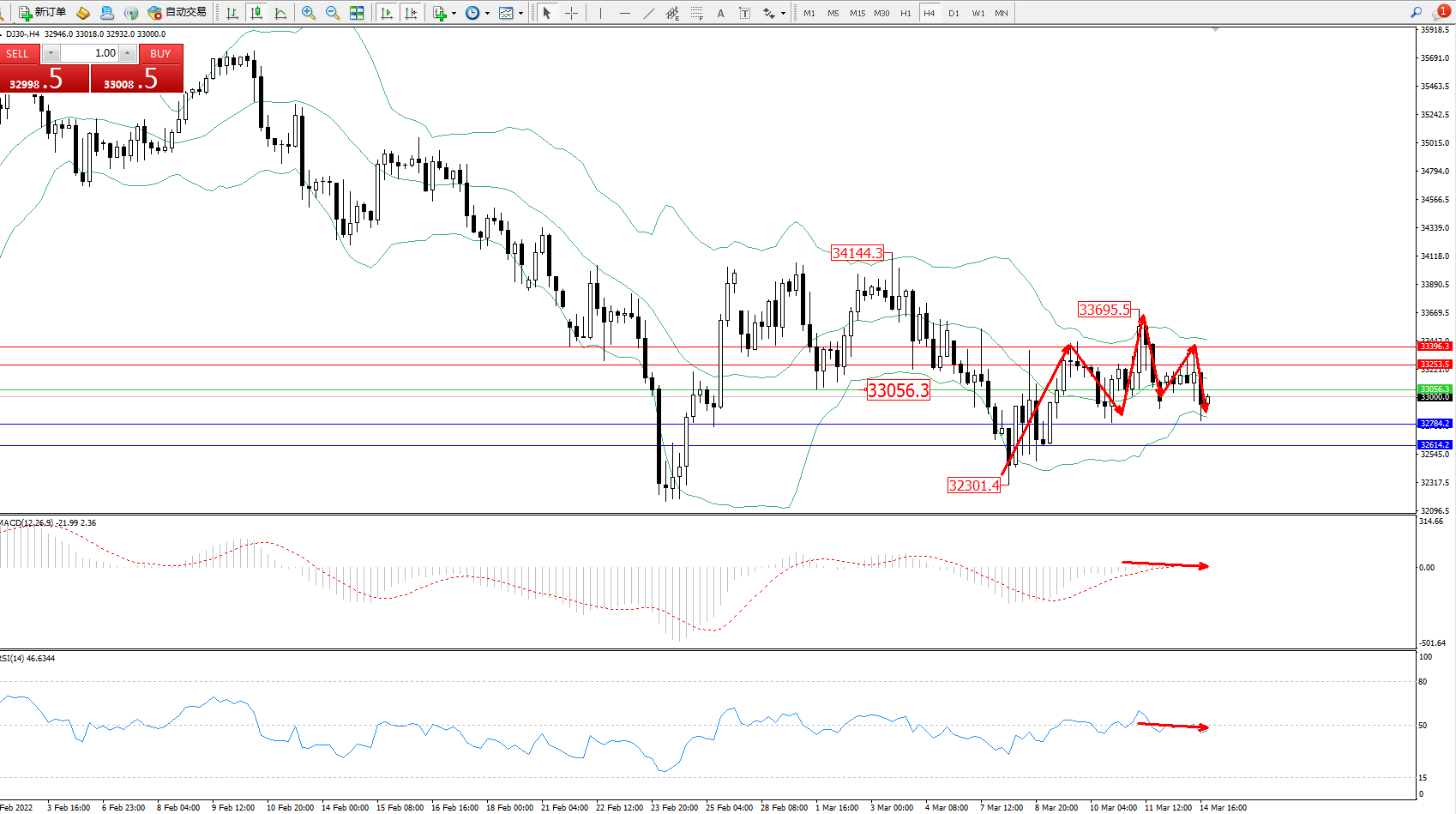 交易策略:33056下方看跌,目标32784、32614