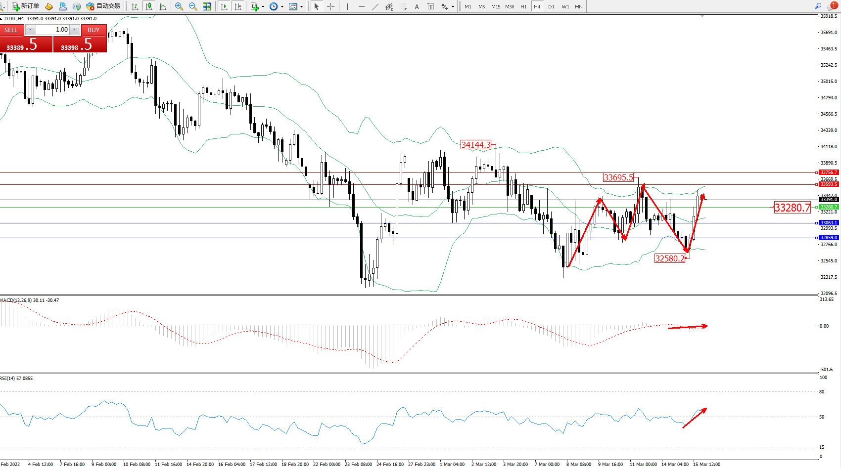 技术点评:长时间维持在布林带指标通道内维持宽幅震荡,低位多头动力维持震荡上移至布林带指标上轨附近节点震荡,短期多头动力有继续向上移动迹象,布林带指标呈收口走势持续平移中,MACD指标处于0轴线附近弱势徘徊,RSI指标处于空头区域维持震荡上移至50均衡线上側徘徊中;