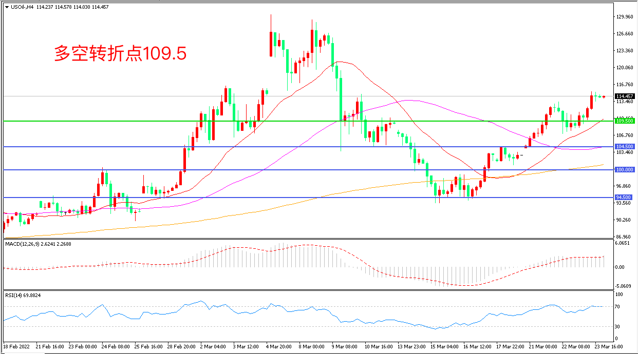 周三(3月23日),乌克兰谈判代表周三称俄乌谈判遇到“重大困难”而里海因罕见的风暴破坏,已暂停向管道输油,原油供应可能会减少多达100万桶/天,占全球原油产量的1%。,美国WTI原油大幅拉升,收报114.48美元/桶。今晚拜登将参加北约特别峰会和欧洲理事会峰会,届时可能会宣布对俄罗斯实施更多的制裁,如果俄乌局势进一步恶化,油价可能还会飙升