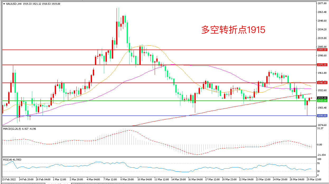 周二(3月29日),俄乌谈判传来积极信号,有消息称俄乌两国总统的会面可与两国草签和平条约同时进行,避险情绪回落导致金价一度下挫,现货黄金探底回升,收报1922.04美元/盎司。目前投资者的焦点已经从俄乌局势逐渐转变到美联储加息及如何应对飙升的的通货膨胀、就业数据表现是重要的一环,重点关注今晚即将公布的ADP就业数据表现。