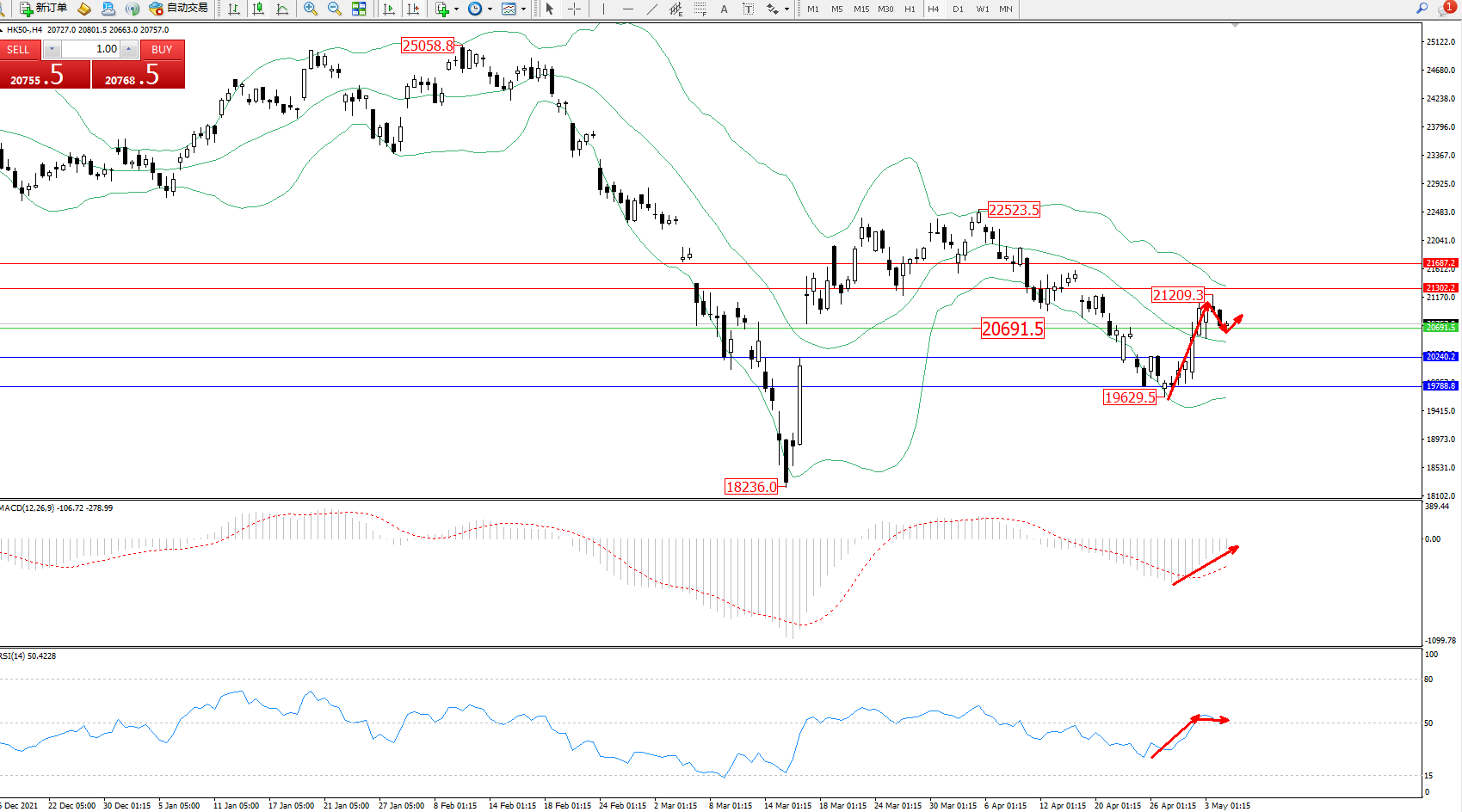 香港恒生指数5月4日(周三)收盘下跌232.37点,跌幅1.1%,报20869.52点;港股主要指数全天呈单边下跌行情,市场情绪表现低迷,热门板块普跌。恒生科技指数跌3.23%。昨日走出大逆转的大型科技股普遍走低,快手跌近6%,京东、美团跌超5%,腾讯、阿里巴巴、百度均跌超3%;高铁基建股午后上扬明显、香港本地股在弱势中表现活跃。香港特区财经事务及库务局长许正宇表示,新冠疫情和紧张的地缘政治局势,令环球金融市场大幅波动;但港元市场如常有序运作,暂时未见资金异常进出;银行体系亦保持稳定,港交所交易结算和交收有秩序地进行。他表示,香港有稳健成熟的监管制度,金融市场运作仍然良好,而且香港外汇储备充足,规模超过4800亿美元,相当于货币基础的1.8倍,支持联汇制度。港股通南向交易的股票以人民币计价展开筹备工作,并正与内地有关当局和业界推进有关工作。