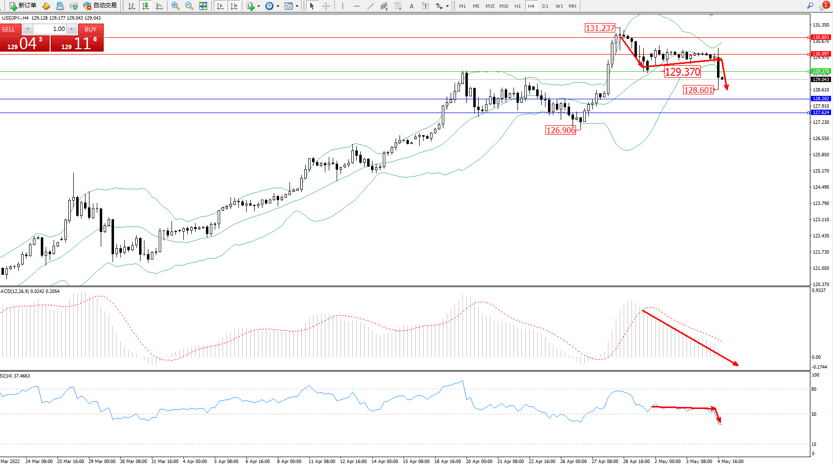 技术点评:高位长时间维持窄幅整理平移后,空头动力伺机入场,强势下挫,跌破布林带指标下轨至128.601附近节点后整理,短期空头动力有继续下行迹象,布林带指标呈收口走势后开始张口,MACD指标处于多头区域维持震荡不断下行中,RSI指标维持弱势整理平移后急速跌破50均衡线进入空头区域快速下挫;