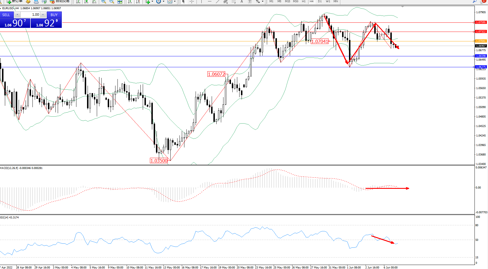 交易策略:1.07041下方看跌,目标1.06598、1.06275