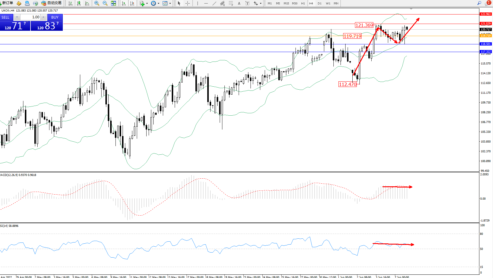 技术点评:多头动力延续布林带指标通道中上轨区间持续震荡上扬,高位抵达121.369附近节点后开始整理,短期多头动力依旧有上移迹象,布林带指标呈收口走势持续中,MACD指标处于多头区域高位维持整理平移,RSI指标处于多头区域窄幅徘徊中;
