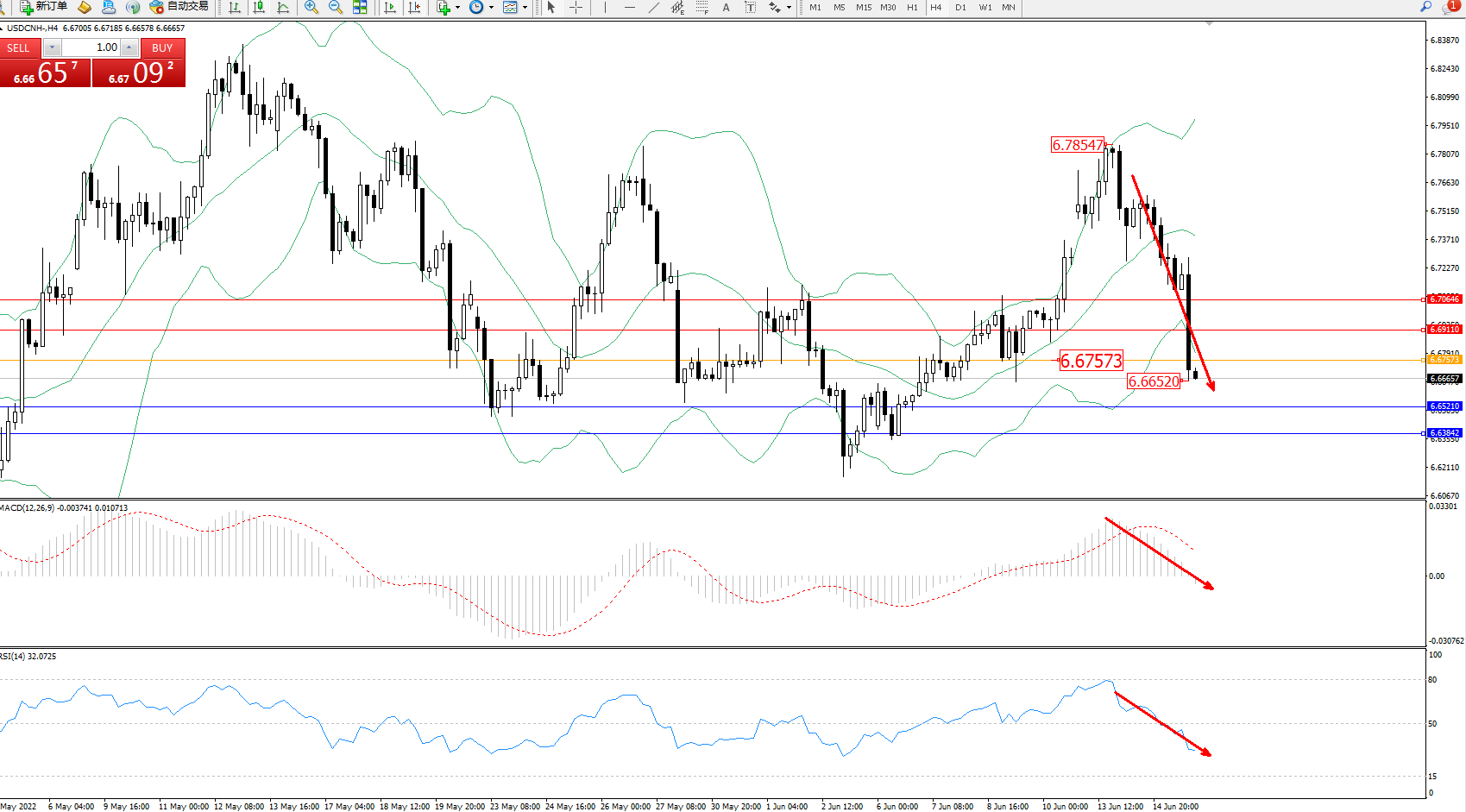 交易策略:在6.67573下方看跌,目标6.65210、6.63842