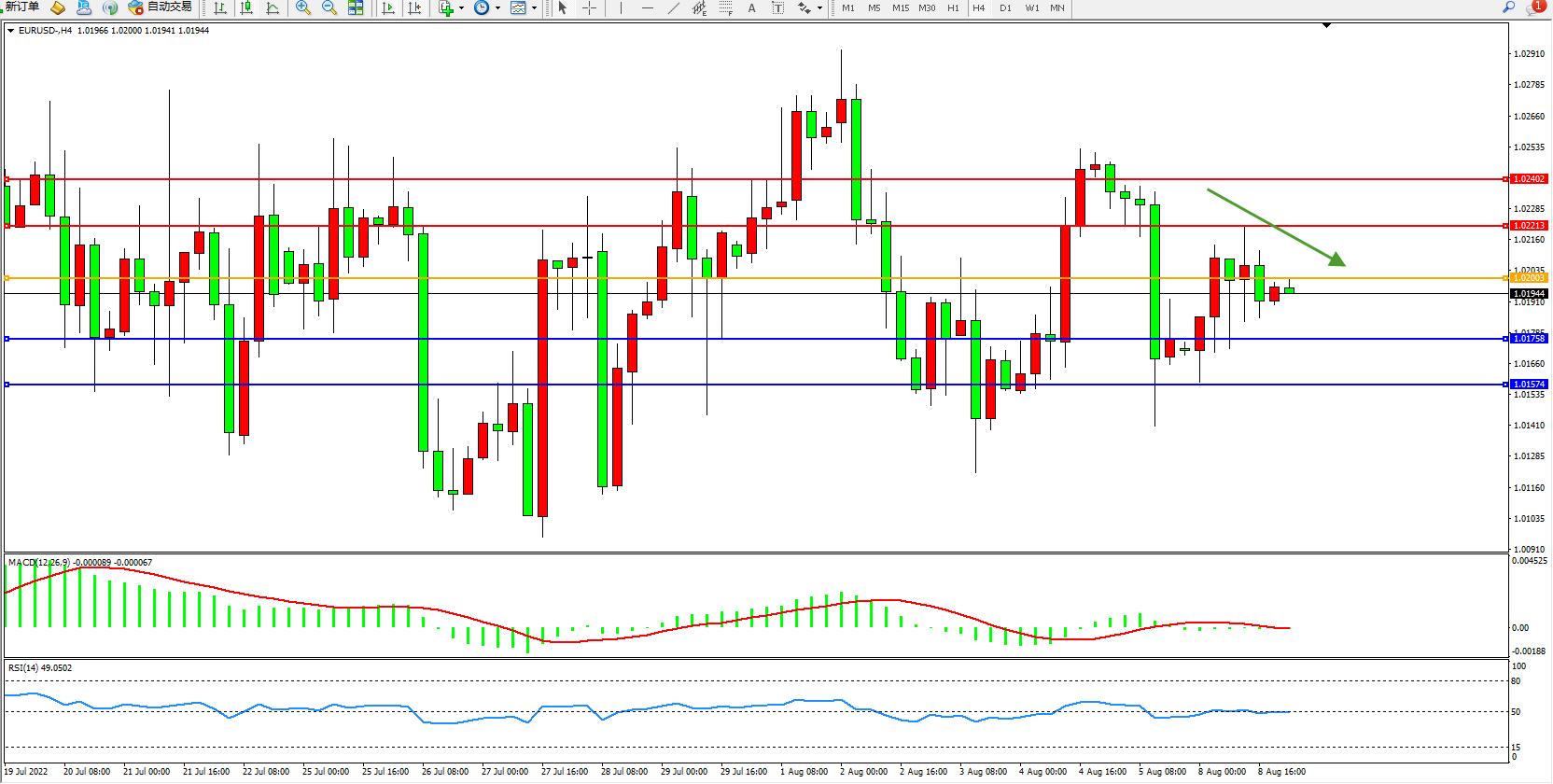 4小时图看:波幅空间开始逐渐收窄,短期空头动力有伺机入场迹象,MACD指标处于0轴线附近徘徊,RSI指标处于50均衡线附近弱势整理;