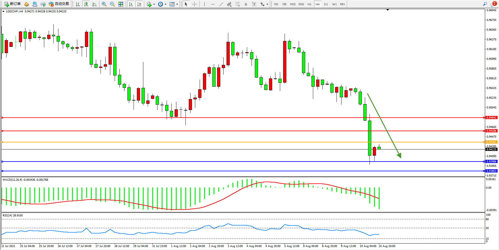 美元兑瑞郎维持0.94225附近震荡, 美国通胀意外回落,同时美联储的大幅度加息措施确实起到了压低通胀的作用,该数据意味着美联储在9月会议上继续大幅度加息75基点的预期大幅度下降。