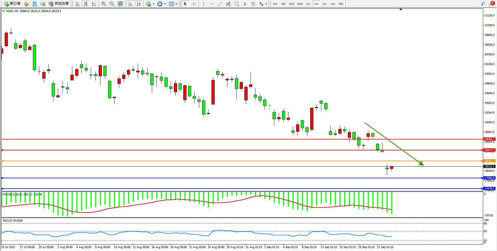 香港恒生指数9月22日(周四)收盘下跌296.67点,跌幅1.61%,报18147.95点;美联储加息75基点,引发全球“加息潮”,风险市场大幅震荡下跌。港股三大指数再度下挫,恒指跌1.61%,盘中跌破18000点且创近11年新低,国指、恒生科技指数分别跌1.14%和1.7%,二者均刷新调整低价。市场风向标的科技股集体走低,南下资金逆势净流入42.35亿港元,大市成交额为851亿港元。