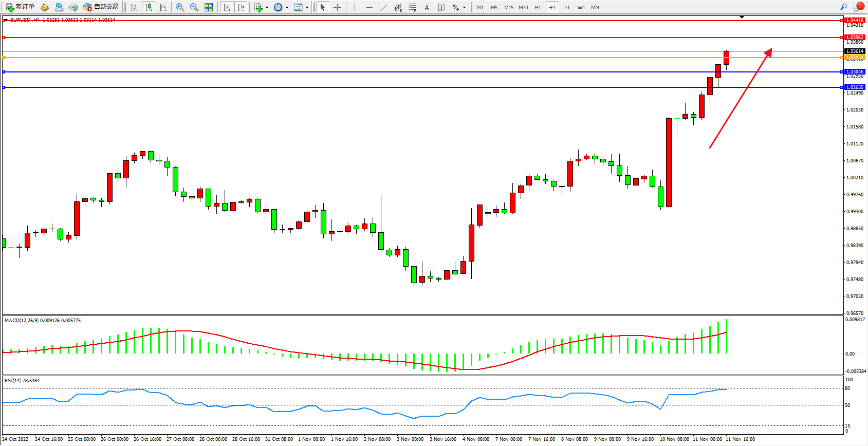 欧元美元EURUSD—4小时K线图显示: