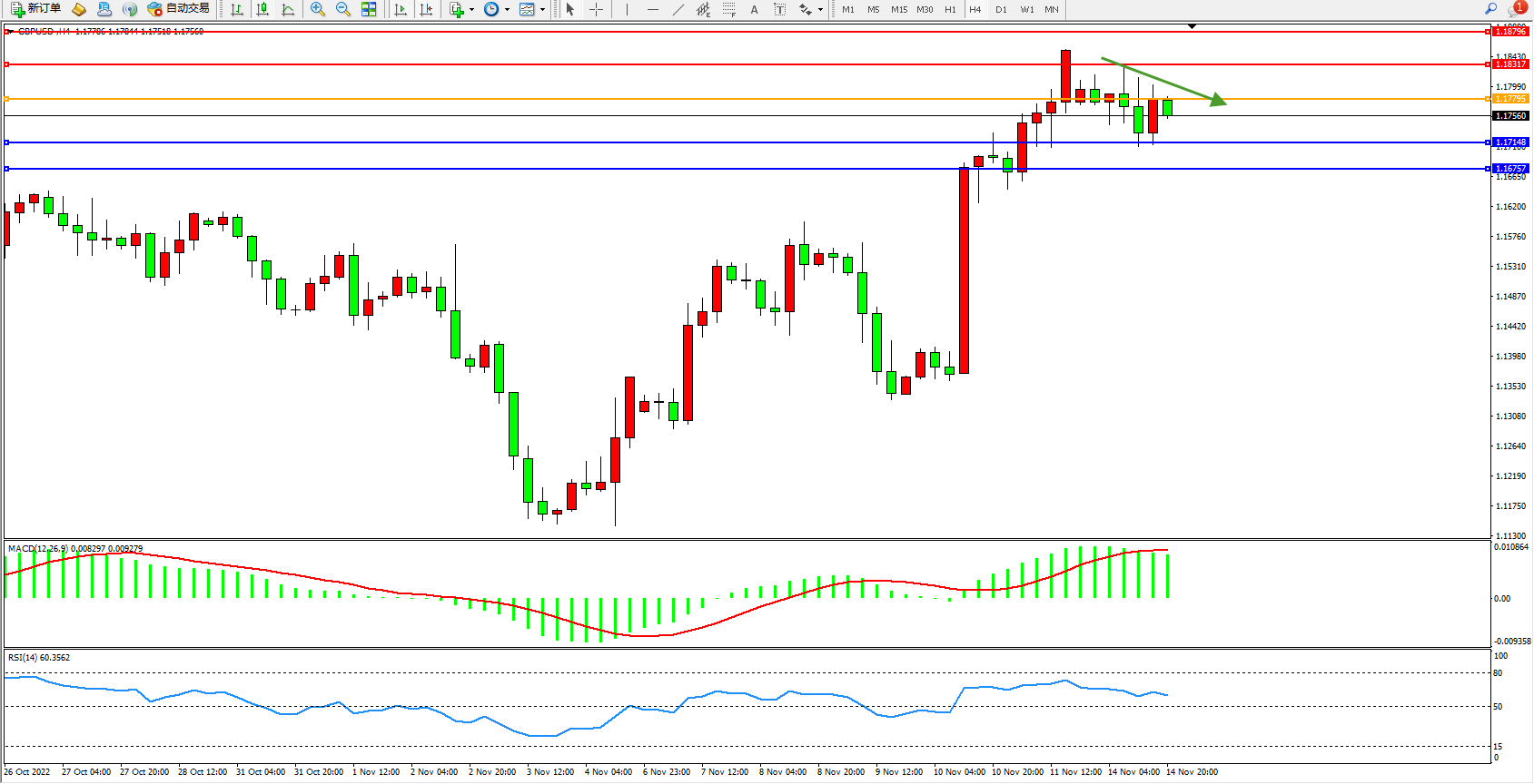 交易策略:1.17795下方看跌,目标1.17148、1.16757