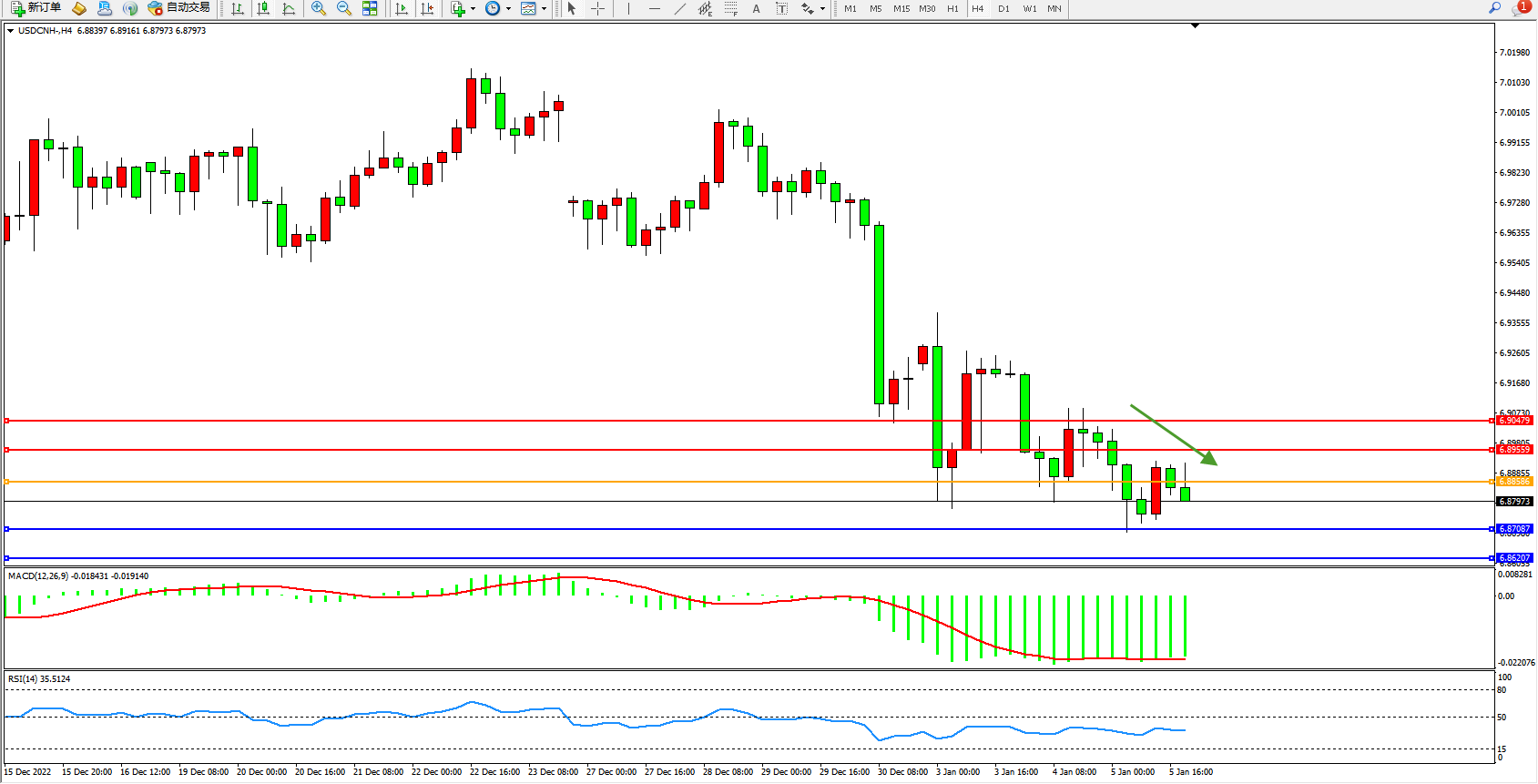 美元人民币USDCNH——4小时K线图显示: