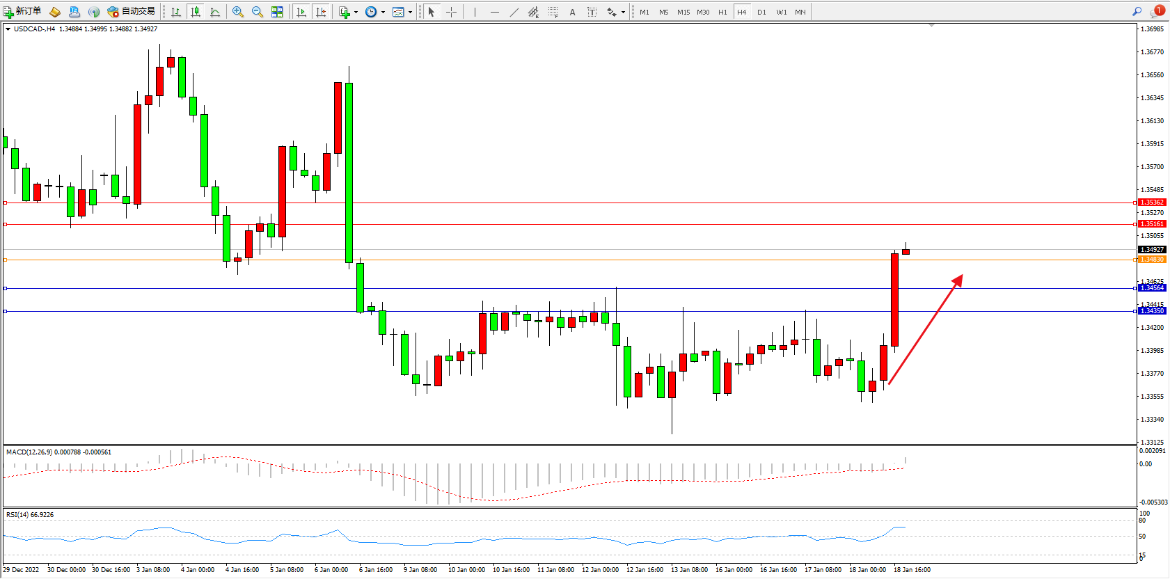 4小时图看:多头动力急速攀升,短期看涨情绪笼罩,市场多头不断上移,MACD指标处于0轴线上侧徘徊,RSI指标处于多头区域整理;