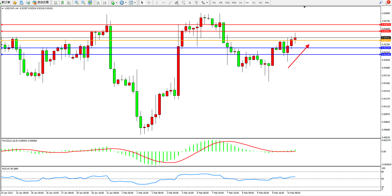 交易策略:0.92377上方看涨,目标0.92551、0.92676
