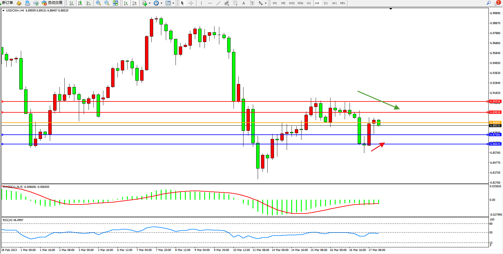 交易策略:6.88800下方看跌,目标6.87581  6.86635
