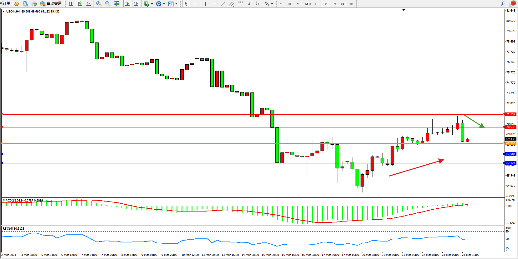原油维持69.432附近震荡,美联储主席鲍威尔强调世界最大经济体面临信贷风险,且上周美国原油库存增幅超过预期。但中国需求前景被普遍看好,这限制了油价下行空间。
