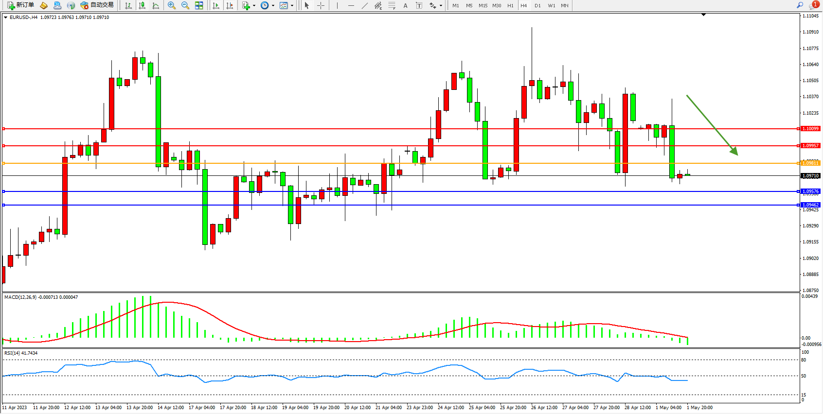 欧元兑美元维持1.09710附近震荡,欧洲央行面临的问题是通胀将持续多久,以及第二轮效应是否正在出现。预计本周将加息 25 个基点,因为欧洲央行平衡了之前加息、近期银行业动荡和进一步收紧政策的滞后效应。