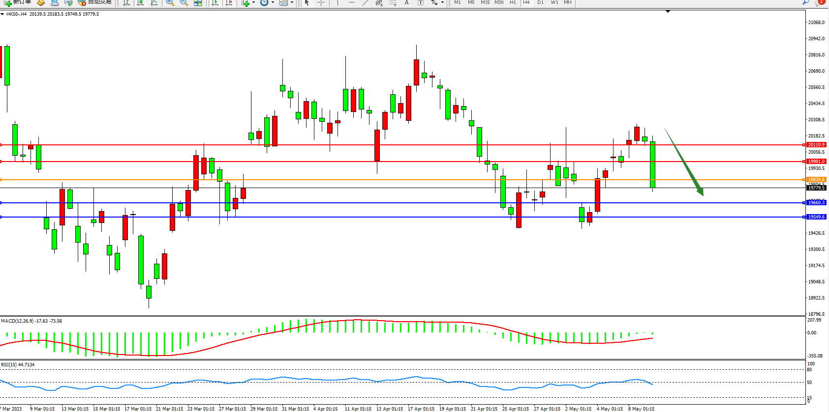 香港恒生指数5月9日(周二)收盘下跌429.45点,跌幅2.12%,报19867.58点;港股三大指数午后大幅走低,中特估个股下挫叠加权重科技股普跌,市场情绪表现低迷。恒指跌2.12%再度失守2万点大关,国指跌2.36%,恒生科技指数跌2.95%。大型科技股下跌明显,百度跌4.46%,腾讯、快手跌超3%。南下资金全日净流入27.56亿港元,大市成交额为1221亿港元。