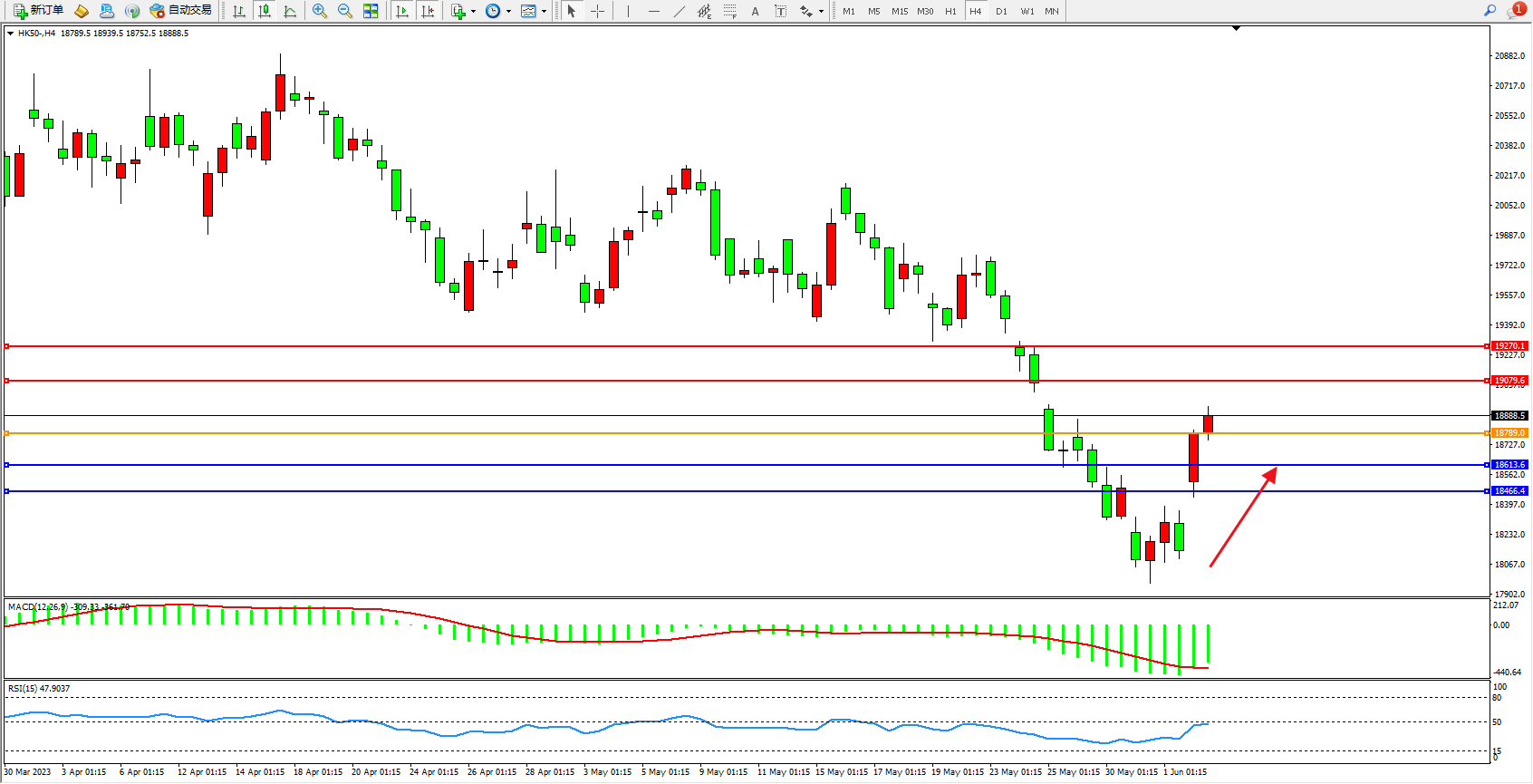香港恒生指数6月2日(周五)收盘上涨733.03点,涨幅4.02%,报18949.94点;近期影响市场的美债券上限法案落定,叠加美联储开始有暂停加息的吹风。连续下跌的港股迎来暴力反弹,恒生科技指数大涨5.33%领衔,恒指、国指分别上涨4.02%和4.53%,恒指上扬733点,盘中曾收复19000点。大型科技股全线拉升助力大市走俏,美团、百度劲升逾7%,南下资金全日逆势净流出1.24亿港元,大市成交额放大至1491亿港元。