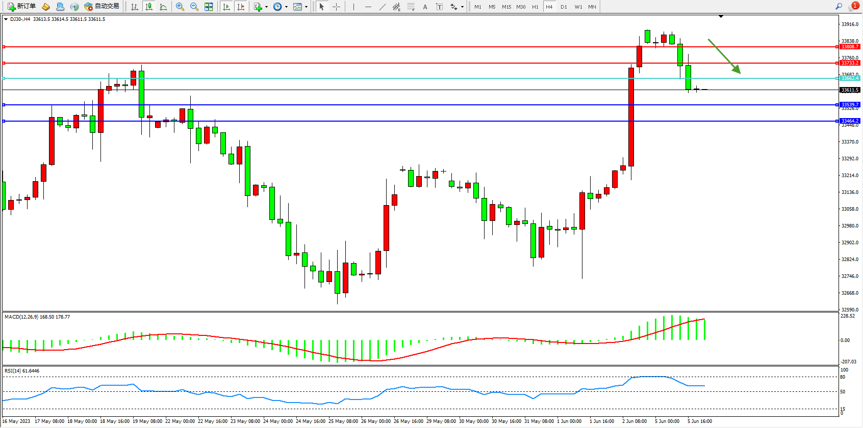 道琼斯工业平均指数收跌199.90点,跌幅0.59%,报33562.86点。美国5月ISM非制造业指数降至50.3,创2023年新低,预期会从51.9上升至52.4;商业活动和订单下滑,物价支付指标创三年新低。