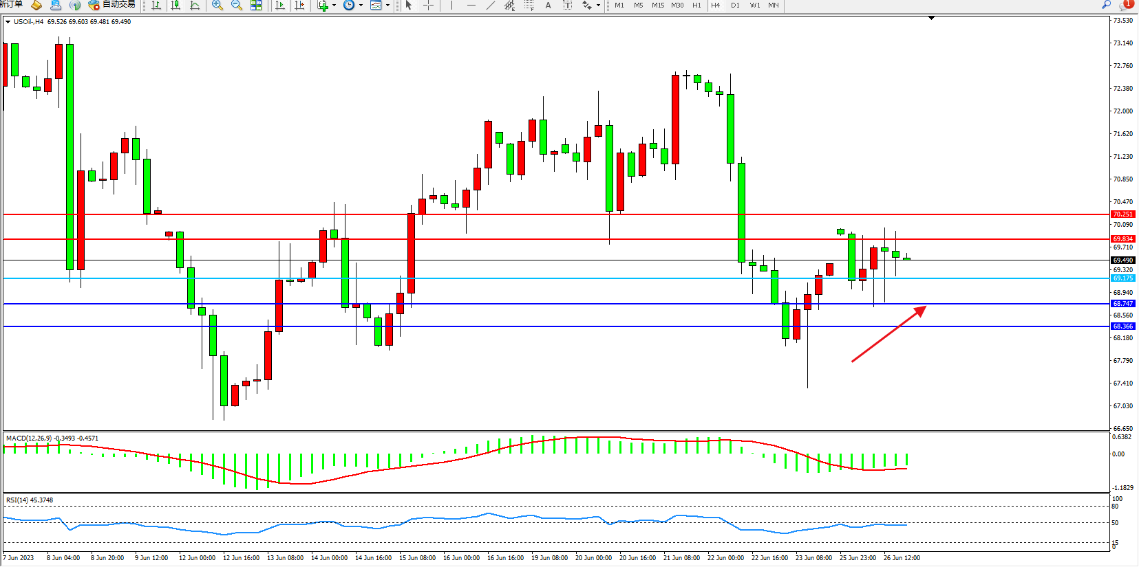 交易策略:69.175上方看涨,目标69.834 70.251