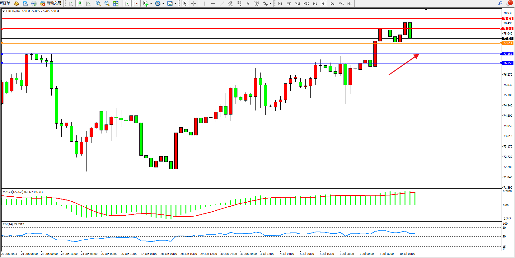 4小时图看:高位多头动力拉升后震荡,市场看涨情绪依据,短期有继续向上移动态势,MACD指标处于多头区域高位整理,RSI指标处于多头区域维持徘徊;