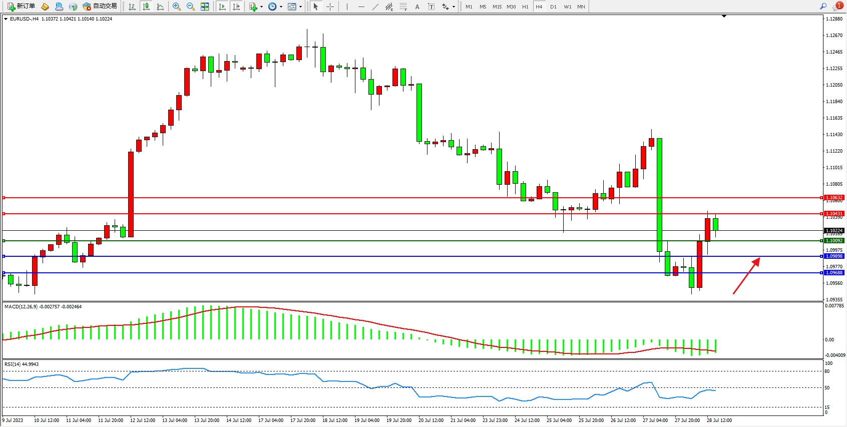 欧元美元EURUSD—4小时K线图显示: